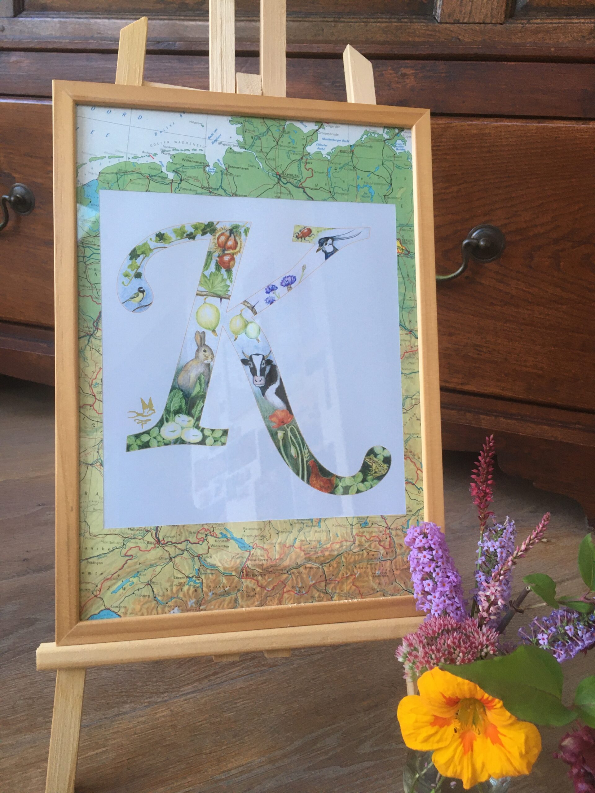 Deze letter K is oorspronkelijk met kleurpotlood ‘geschilderd’. De letter is ingekleurd met 7 dieren en 7 planten, waarvan de eerste letter in het Nederlands begint met een K. Kijk voor meer achtergrond op Flora & Fauna alfabet.